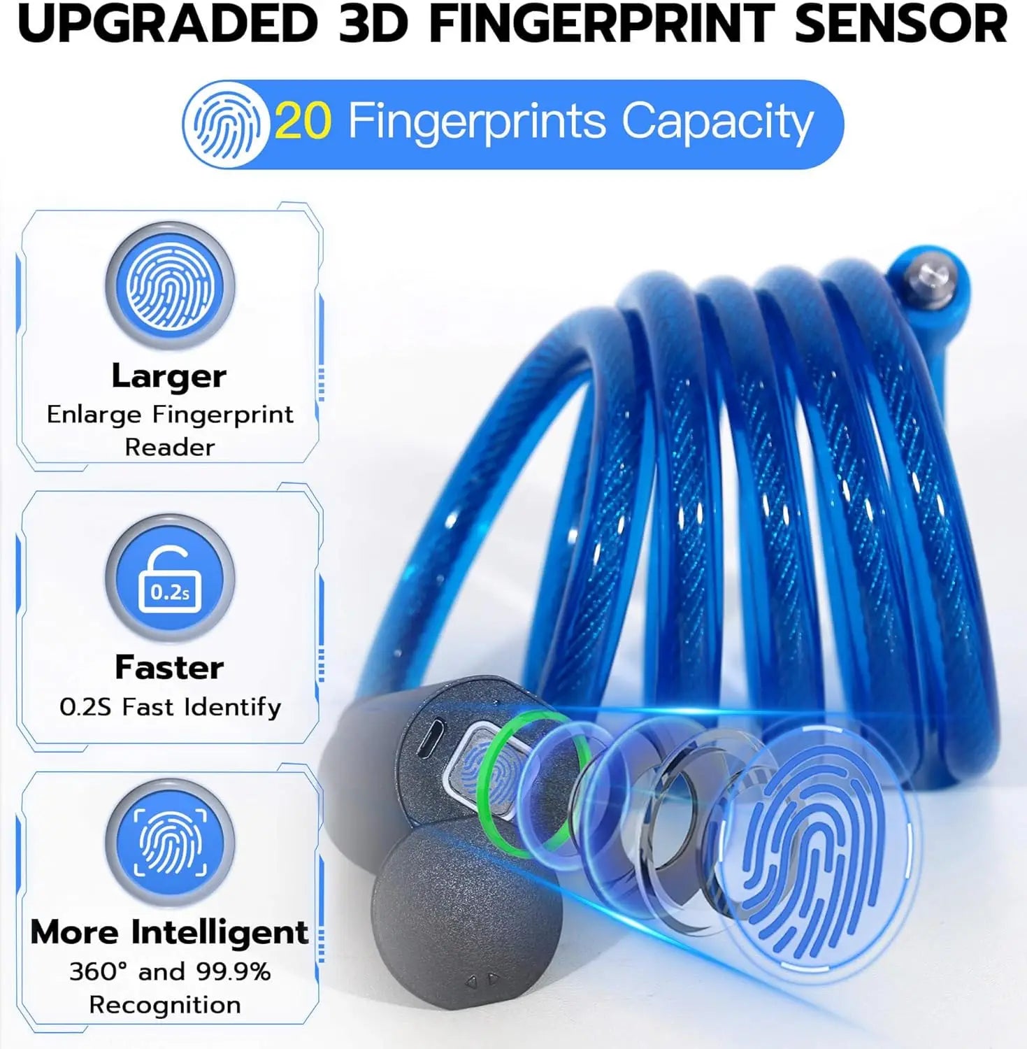 🔒【Fingerprint Unlock】: Fingerprint cable lock uses advanced biometric technology, touch your finger to fingerprint unlock within 0.2 seconds, the unlocking speed is much faster than ordinary rope locks and key locks. Your finger is the key, no longer worry about losing the key or forgetting the password.