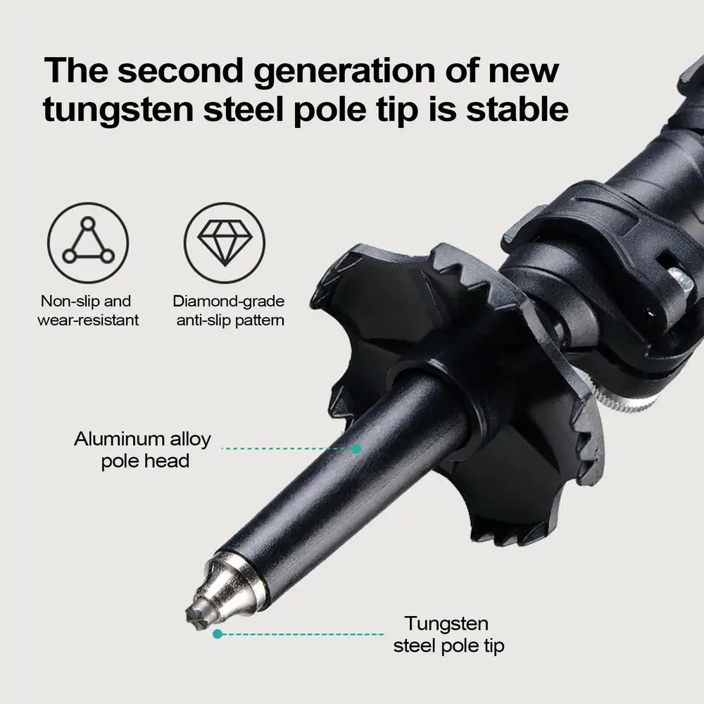 Material: body - 6061 aluminum alloy, handle - EVA, fastener - ABS, webbing - polyester fiber, pole tip - carbon tungsten steel