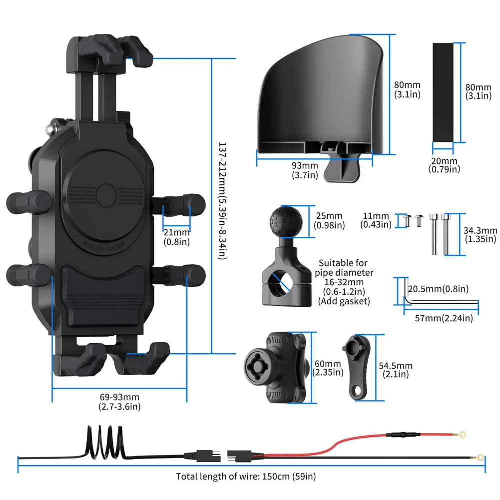 1. Versatile Charging Options: The motorcycle phone holder supports wireless charging, USB, and TYPE-C fast charging, ensuring efficient and quick power-ups for your device. It accommodates phones with widths of 69-93mm, heights of 137-212mm, and thicknesses of 21mm, making it suitable for most smartphones.