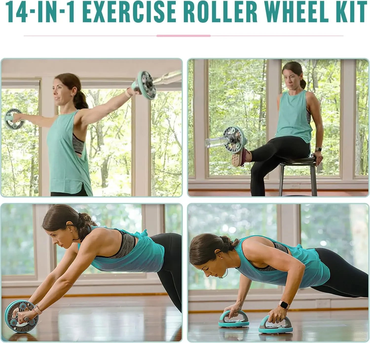 [Multi-Functional Use]: This 14-in-1 exercise roller set allows you to use it in a variety of ways, including ab roller, dumbbell roller, push-up roller, resistance band roller, innovative resistance band, and joint mobility roller. It can be used to target fat in various areas of the body, such as the abdomen, waist, buttocks, and arms.