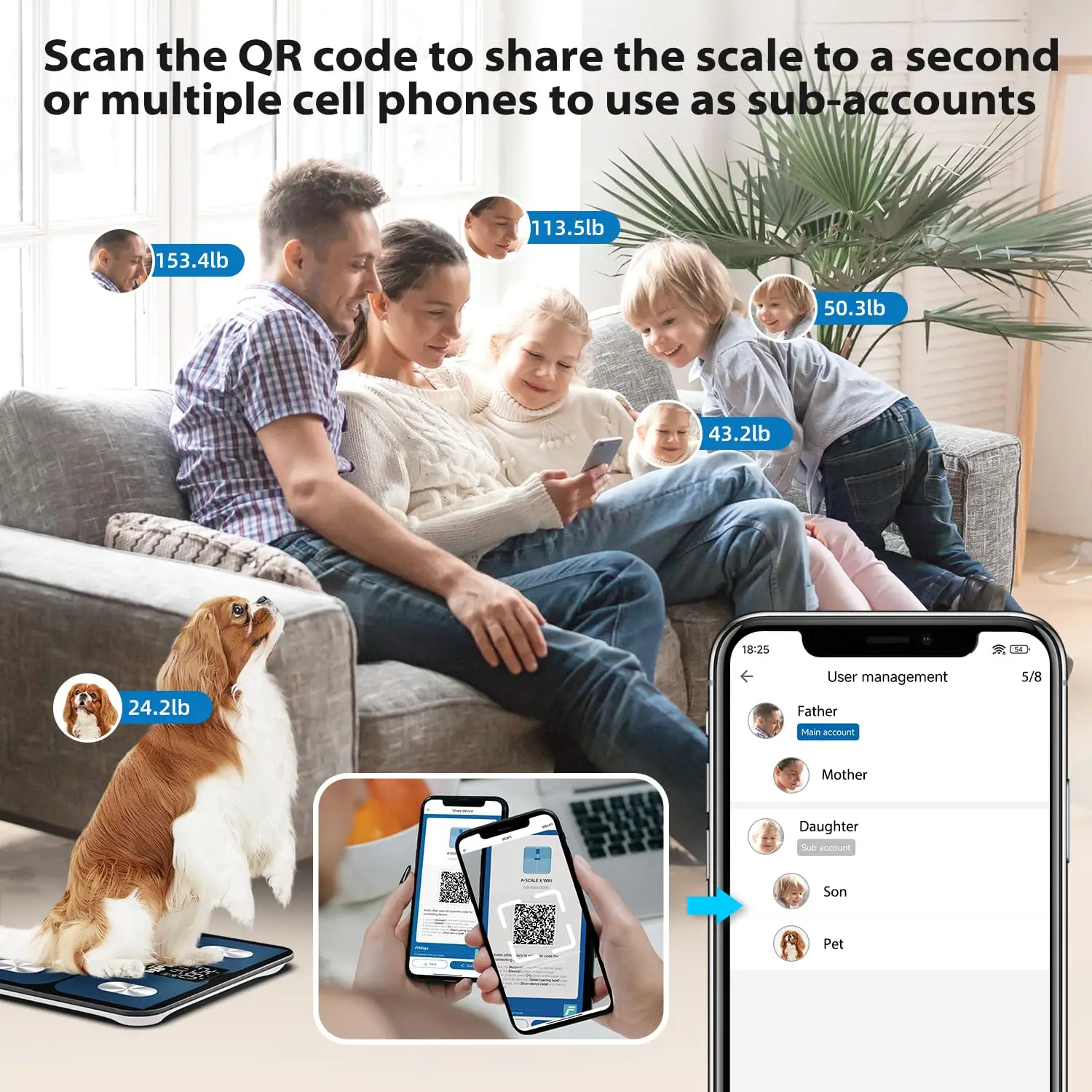 **Advanced Health Monitoring Made Simple** Transform your wellness journey with our intelligent body composition scale that delivers comprehensive health insights right at your fingertips. **KEY FEATURES:** • **Instant LED Trend Display** - View 6 essential body metrics directly on the scale screen without needing your phone: Weight, Body Fat Percentage, BMI, Body Water Percentage, Muscle Mass, and Body Type Analysis. Get immediate health feedback with just a glance. • **Flexible App-Free Operation** - Enjoy complete independence from your smartphone. Create user profiles directly on the scale and track your daily progress without any app connection. Perfect for quick morning check-ins or when you prefer to disconnect from technology. • **Multi-User Smart Recognition** - Supports up to 24 users with automatic identification. The scale intelligently recognizes each family member when they step on, keeping everyone's health data separate and private. Ideal for households with multiple users tracking their fitness goals. • **Professional-Grade Accuracy** - Experience reliable measurements with advanced bioimpedance analysis technology. Four high-precision sensors provide consistent readings with 0.1 lb / 0.05 kg precision and a maximum capacity of 400 lb / 180 kg. Trust the data that guides your health decisions. • **Seamless Data Synchronization** - When connected via Bluetooth, all measurements automatically sync to compatible fitness applications. Access detailed charts and trends showing 18 different body composition metrics over days, weeks, months, or years to monitor your progress effectively. • **Family Health Management** - Share access easily within your household through simple QR code scanning. Each family member can maintain their own profile while contributing to collective wellness goals. Keep everyone motivated and accountable. • **Specialized Tracking Modes** - Choose from multiple specialized modes including Baby Monitoring for little ones or pets, Pregnancy Tracking for expectant mothers, and Athlete Mode for fitness enthusiasts. Tailor the scale to match your specific lifestyle needs. **TECHNICAL SPECIFICATIONS:** - Maximum Weight Capacity: 400 lb / 180 kg - Measurement Precision: 0.1 lb / 0.05 kg - Display Type: High-contrast LED column trend display - Connectivity: Bluetooth technology for data synchronization - User Capacity: Supports up to 24 individual profiles - Power Source: Standard batteries included - Auto-Recognition: Intelligent user detection system The perfect solution for individuals and families committed to maintaining optimal health through accurate body composition tracking.
