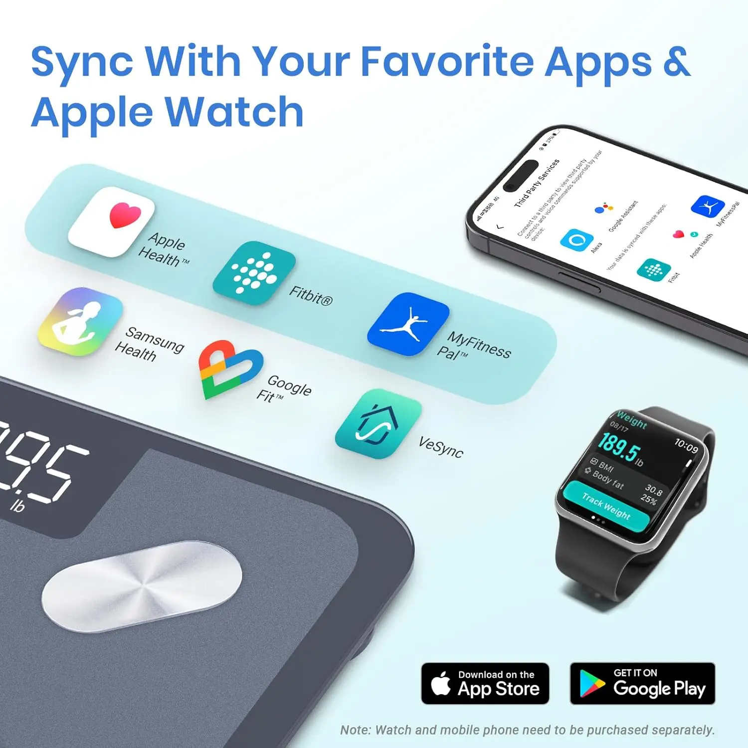 Discover a smarter way to track your health and fitness with our advanced digital scale. This versatile device offers precise measurements and seamless integration into your daily routine, helping you achieve your wellness goals effortlessly. Key Features: - **Comprehensive Health Tracking**: Accurately measure body weight, fat percentage, BMI, muscle mass, and more with high-precision sensors that provide increments as small as 0.05 lb. Gain insights into 13 biometrics to monitor your progress effectively. - **Seamless App Integration**: Elevate your fitness journey by syncing data with popular apps like Apple Health, Samsung Health, Google Fit, FitBit, and MyFitnessPal. Compatible with Apple Watch for added convenience. Enjoy hands-free voice control when connected to Alexa for quick access to information. - **Versatile Weighing Modes**: Designed for all your needs with three specialized modes: Zero-Current Mode ensures safe weighing for users of all ages; Baby Mode tracks growth patterns for infants or pets; Light Items Mode accurately weighs items as light as 100g. - **User-Friendly Experience**: Supports unlimited users in one household, making it ideal for families or shared spaces. Set personalized goals, view detailed progress graphs, and receive customized diet and exercise recommendations based on your habits—all through an intuitive app interface. - **Reliable Performance**: Built on years of expertise in health technology, this scale is trusted by millions worldwide across over 30 countries. It combines durability with accuracy up to a maximum capacity of 400 lb (181 kg), ensuring long-term reliability. Why Choose Our Scale? This smart scale not only provides accurate measurements but also enhances your overall wellness strategy. By integrating seamlessly into your lifestyle and offering actionable insights through its app features like goal-setting tools and privacy-focused design that prioritizes data security without compromising functionality—it's the perfect companion for anyone looking to improve their health outcomes efficiently while enjoying ease-of-use every day.
