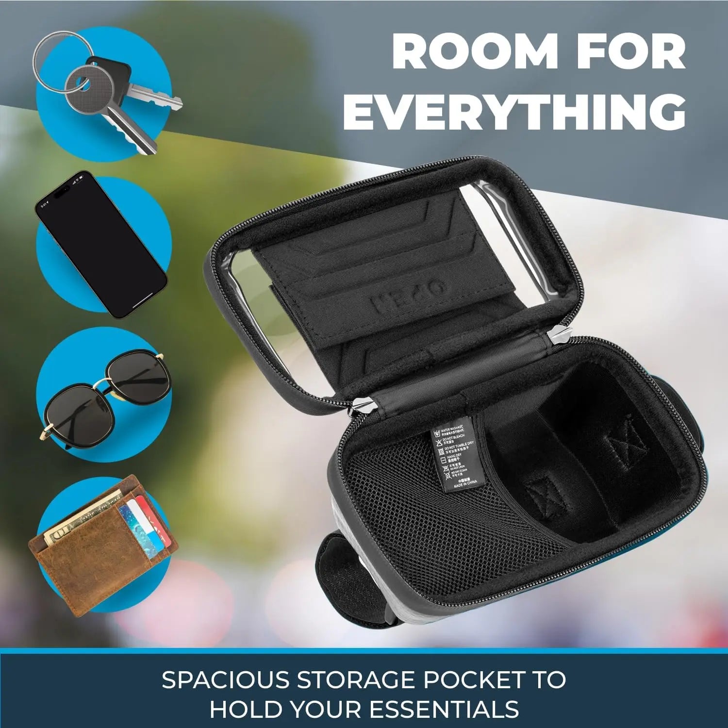Built to withstand just about any weather conditions! This secure smartphone holder + storage space will keep your expensive phone dry while you use it. The inner pocket zippers shut, keeping your keys, wallet, and more safe and sound.