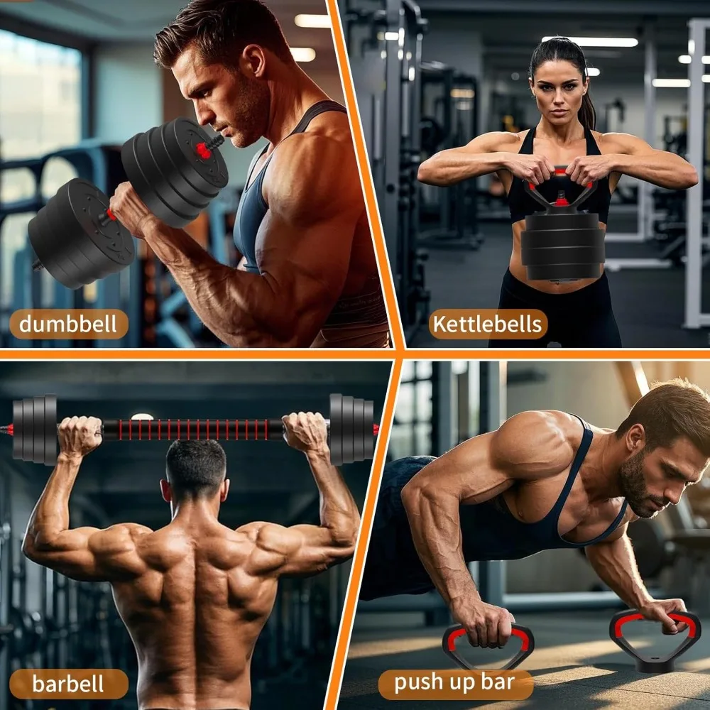 This adjustable dumbbell set offers versatility for workouts at home or in the gym, catering to fitness enthusiasts of all levels. It features three modes of use: as dumbbells, a barbell, and for push-ups, allowing you to target various muscle groups effectively. Whether you're working on your biceps, toning your shoulders, or enhancing core strength, this set is your ultimate fitness companion. Our dumbbell set is crafted with high-quality materials, featuring weight plates filled with cement and wrapped in durable PE material to protect your floors. The thickened foam connecting bars are ergonomically designed to reduce shoulder pressure and prevent sports injuries. The anti-slip texture on the dumbbell bars ensures a secure grip, making your workouts safer and more efficient. With our adjustable weight system, you can easily customize the weight to suit your fitness goals. The detachable weight plates allow you to adjust the intensity of your workouts, making it perfect for both beginners and advanced users. This set is ideal for men looking to build strength, tone muscles, and improve overall fitness. Designed for convenience, our dumbbell set features a compact and detachable design, allowing you to store the weights under your bed or table, saving valuable space. Whether you're working out at home, in the office, or at the gym, this portable set ensures you can stay fit anytime, anywhere. Our adjustable dumbbell set is perfect for all fitness levels, from professional athletes to beginners. It's an excellent choice for home gyms, offering a variety of exercises to target arms, legs, back, and core muscles. Start your fitness journey today and achieve your health goals with ease!